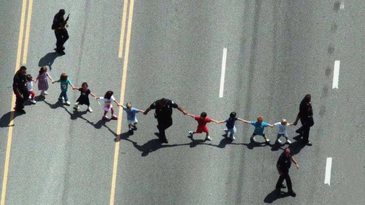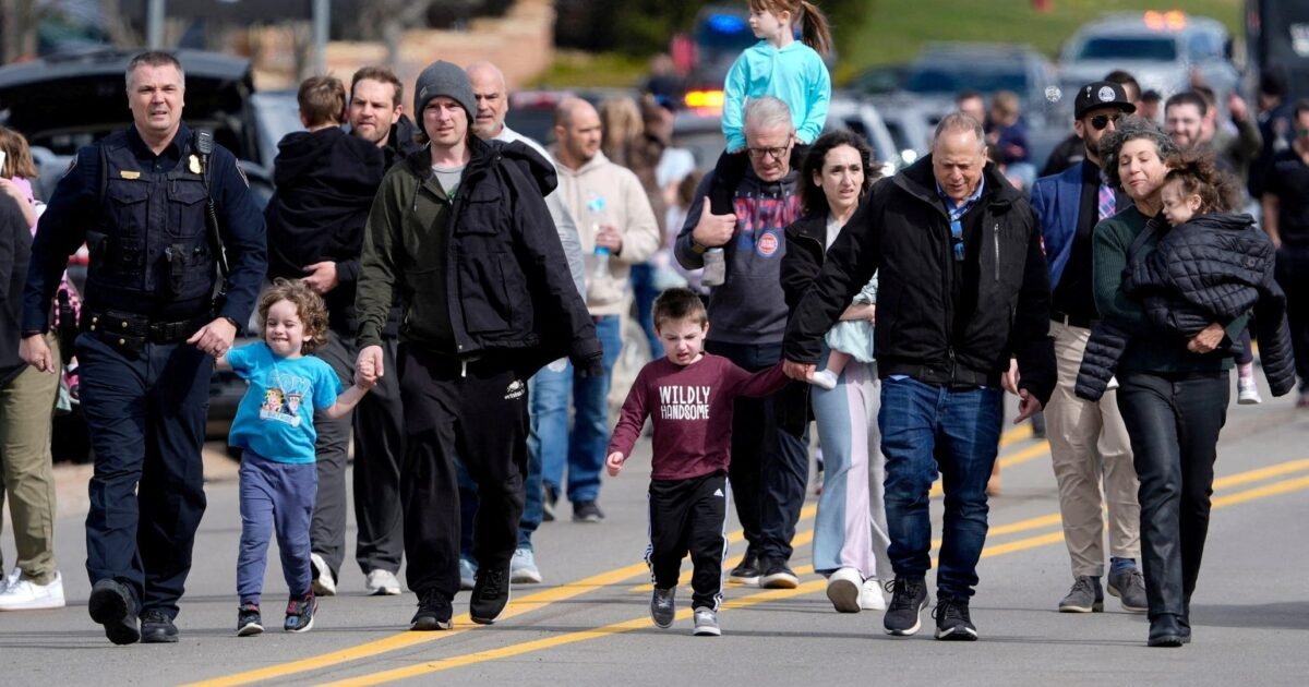 Families being escorted away from Temple Israel on Thursday, March 12, 2026